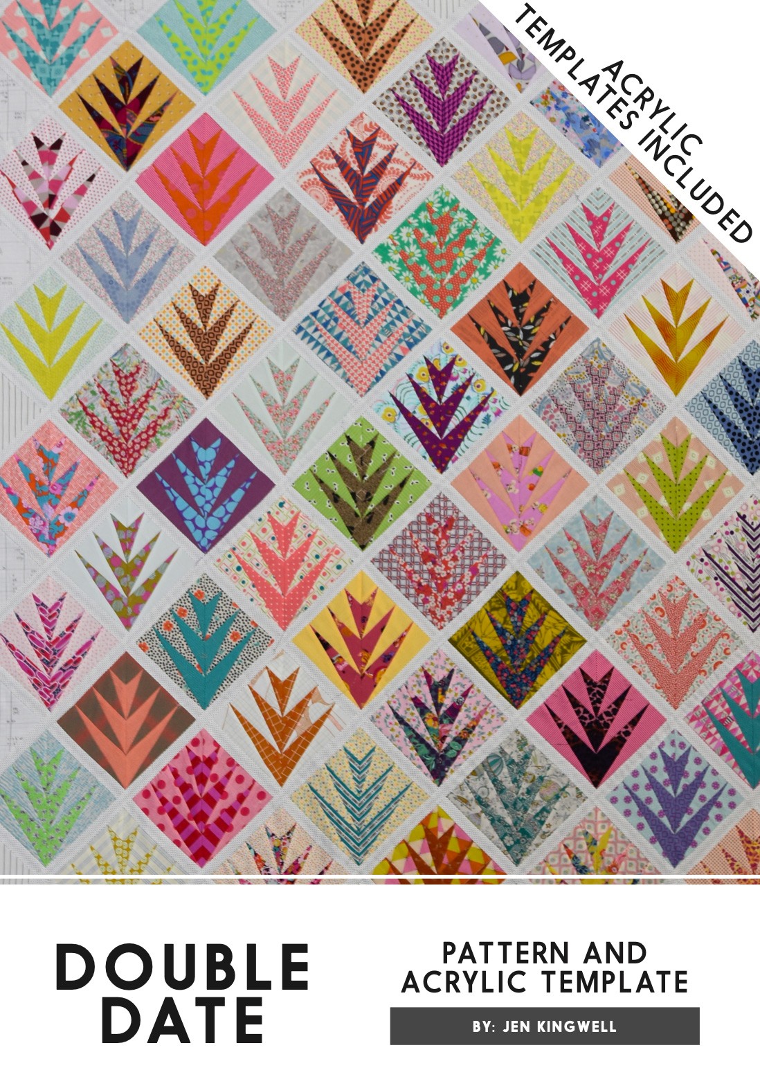 Discover the Double Date Pattern And Template, a modern take on a classic quilt design that measures 171.5cm square (67 1/2”). This pattern offers several different layouts for the finished quilt, providing flexibility for your creative process. The design features vibrant, colorful diamond blocks with intricate patterns, perfect for both hand and machine piecing. It’s an excellent stash buster project, ideal for quilters looking to use up their fabric collection. The kit includes acrylic templates for precise cutting, making it suitable for intermediate skill levels. Enjoy the process of creating a quilt with a mix of geometric and floral motifs, in shades ranging from bright yellows and pinks to deep blues and greens, ensuring your quilt will be both unique and visually stunning.