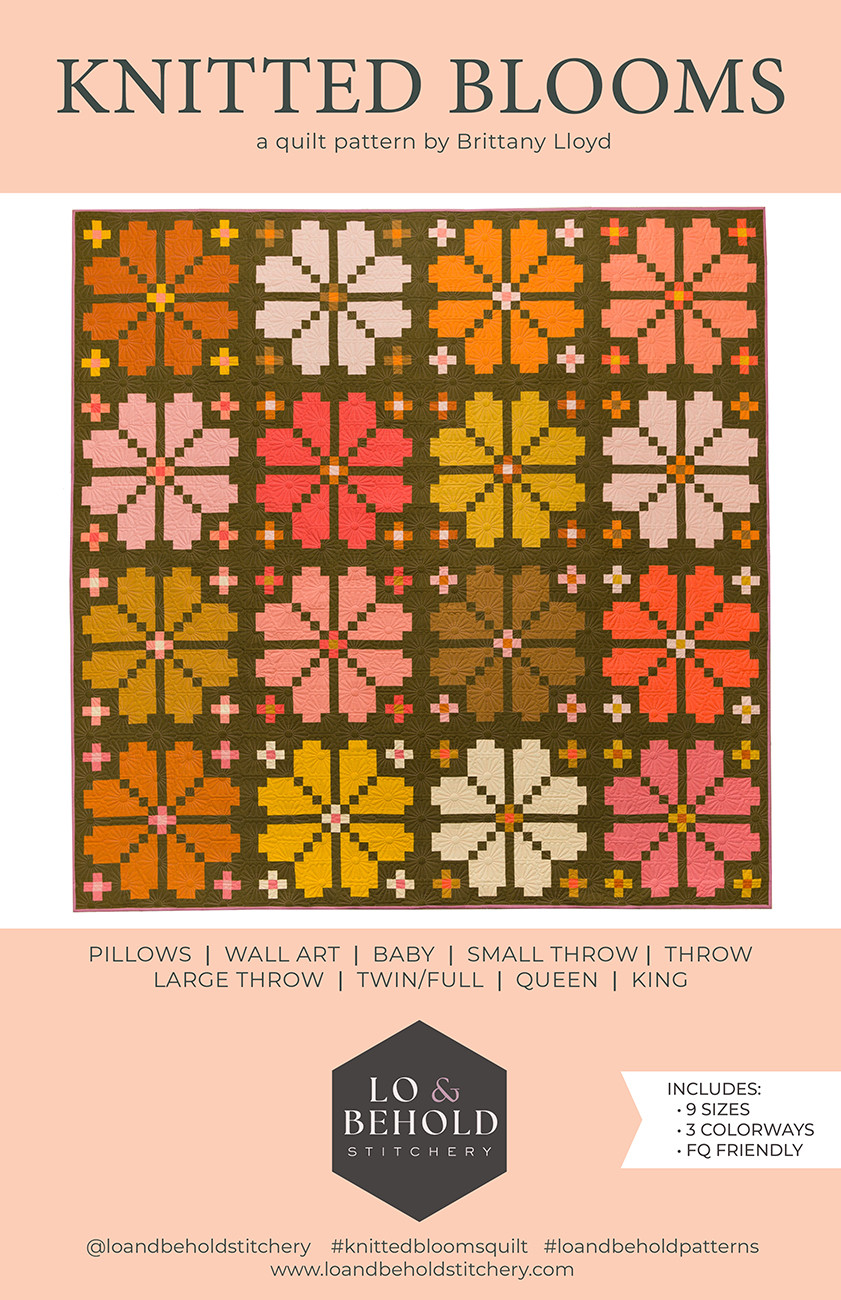 Knitted Blooms is a fun and retro-inspired pattern that uses strip piecing and thoughtful construction to create a bold and modern design. Resembling traditional knitted flowers, Knitted Blooms is a sister pattern to one of Lo & Behold Stitchery’s most beloved patterns, Knitted Star. Choose from 9 different sizes ranging from Pillow to King. This pattern also includes 3 colorway options for the quilt sizes, helpful diagrams, thorough instructions, quilting ideas, coloring pages, and a quilt planner to keep your project organized.