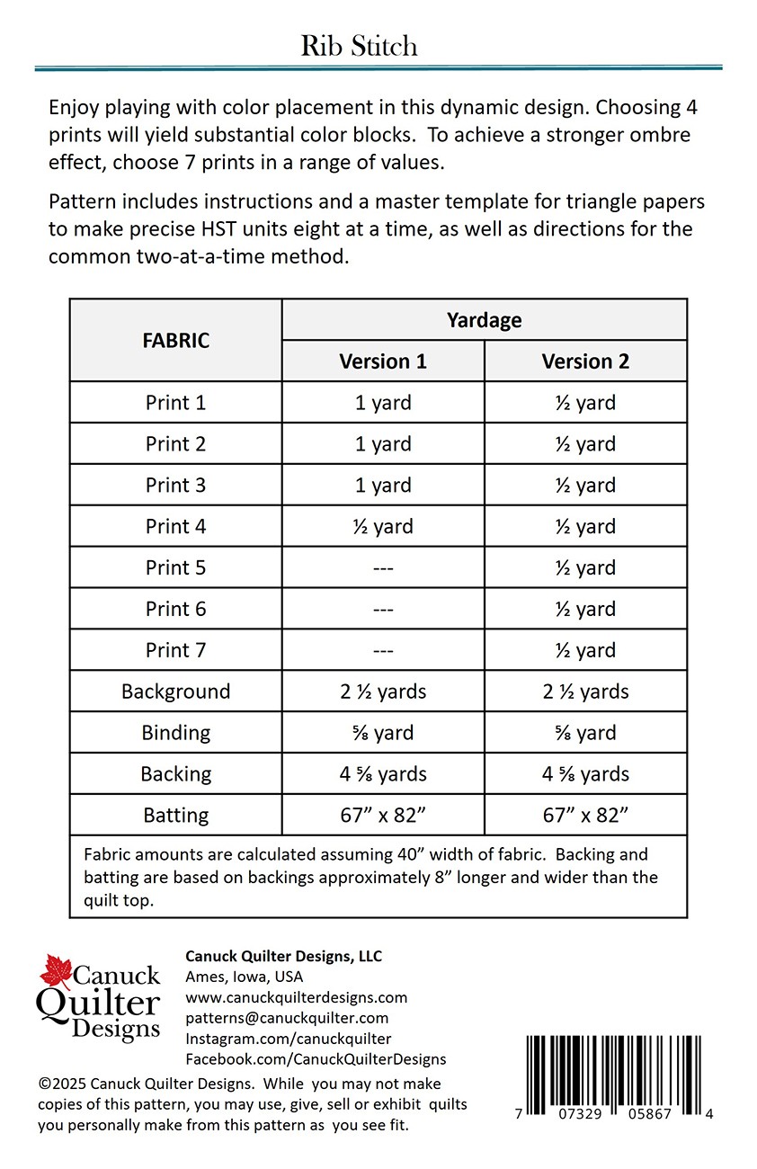 Enjoy playing with color order in this dynamic design. Choosing 4 prints will yield substantial color blocks. To achieve a stronger ombre effect, use 7 prints in a range of values. Pattern includes instructions and a master template for triangle papers to make precise HST eight-at-a-time, as well as the option to use a common two-at-a-time method. Quilt measures 59″ x 74″.